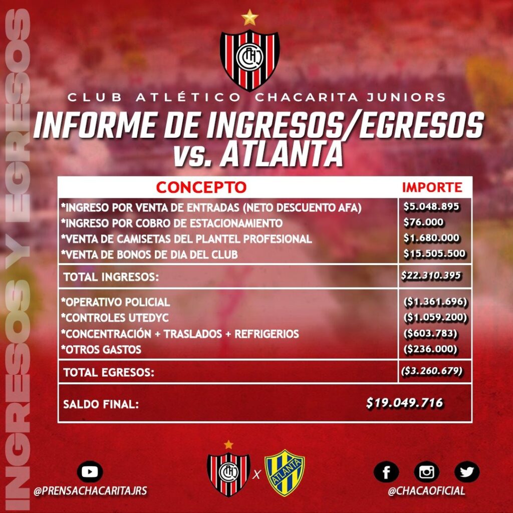 Informamos el detalle de los ingresos y egresos en la organización del partido ante C.A Atlanta el pasado sábado 8 de abril.