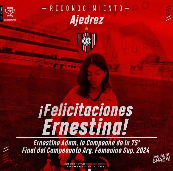 ♟️ ¡Este sábado celebramos a nuestra Campeona Argentina!Ernestina Adam, flamante Campeona Argentina de Ajedrez, nos visita este sábado para compartir una jornada inolvidable con los alumnos y alumnas de la Escuela de Ajedrez de nuestro club.La semana pasada, Ernestina se consagró campeona en la final disputada en Vicente López, escribiendo su nombre en la historia del ajedrez argentino. Con solo 15 años recién cumplidos, no solo logró el título, también se convirtió en la campeona más joven de todos los tiempos.🇾🇪 Ernes es hincha y socia de Chacarita Juniors, y lleva nuestros colores con orgullo en cada tablero. Este sábado, nos regala la oportunidad de celebrar juntos este logro histórico.📅 Fecha: Sábado 7 de diciembre, 11:00 hs📍 Lugar: Estadio de Chacarita, sector plateas (portón 5)Invitamos a toda la comunidad Funebrera a sumarse y vivir este momento único junto a nuestra gran campeona. ¡El ajedrez también es tricolor!